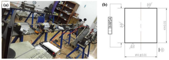 The split Hopkinson pressure equipment in (a) and the corresponding dimension of the sample used for dynamic performance tests in (b).