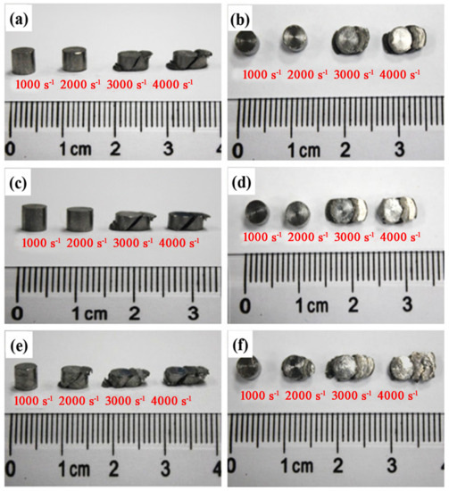 Ti-6321 samples with different microstructures at different strain rates: (a,b) EM; (c,d) DM; (e,f) WM.