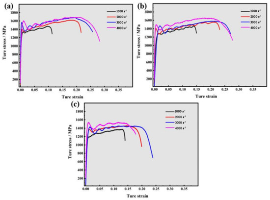 Figure 4a–c show the true stress–strain curves of the Ti-6321 samples with different microstructures under the strain rates of 1000 s−1, 2000 s−1, 3000 s−1 and 4000 s−1, respectively. For the EM samples, the dynamic flow stress at the uniform plastic deformation stage was found to be distinctly increased with the increasing strain rates. However, the EM samples exhibited similar flow stress under the strain rates of 3000 s−1 and 4000 s−1. The dynamic flow stress of DM samples also improved as the strain rate increased, except that the samples showed similar flow stress under the strain rates of 2000 s−1 and 3000 s−1. The WM samples also exhibited improved dynamic flow stress with the increase in strain rate. Similar to the DM sample, the WM samples showed the similar flow stress under the strain rate of 2000 s−1 and 3000 s−1 as well. According to the true stress–strain curves, it can be concluded that the Ti-6321 alloy samples containing equiaxed, duplex and Widmanstätten microstructures all exhibit strain-rate sensitivity and the strain-hardening effect.