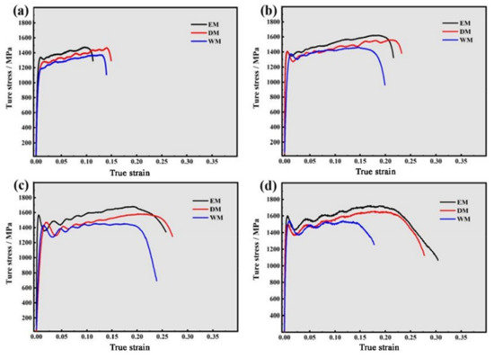 True stress–strain curves of samples with EM, DM and WM at different strain rates: (a) 1000 s−1; (b) 2000 s−1; (c) 3000 s−1; (d) 4000 s−1.