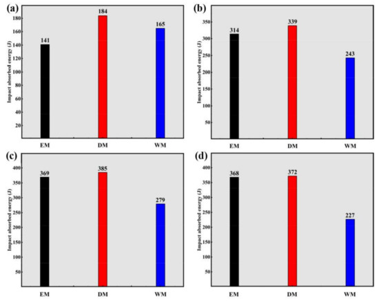 Figure 6 exhibits the impact-absorbed energy of Ti-6321 with EM, DM and WM under the strain rates of 1000 s−1, 2000 s−1, 3000 s−1 and 4000 s−1, which are calculated based on Equation (1). Under the strain rate of 1000 s−1, the DM sample shows the highest impact-absorbed energy and the WM sample exhibits higher impact-absorbed energy than the EM sample. When the strain rate is increased to 2000 s−1, the DM sample shows the highest impact-absorbed energy as well. However, the impact-absorbed energy of the EM sample is much higher than that of the WM sample. When the strain rate is increased to both 3000 s−1 and 4000 s−1, the DM sample shows the highest impact-absorbed energy whereas the WM sample exhibits the lowest impact-absorbed energy. In general, the Ti-6321 alloy with DM shows the highest impact-absorbed energy under each strain rate, indicating that the DM sample has the strongest resistance to dynamic loading as well as excellent dynamic mechanical properties. However, the Ti-6321 alloy with WM shows inferior resistance to dynamic loading which is demonstrated by the premature shear failure of the WM samples.