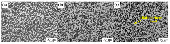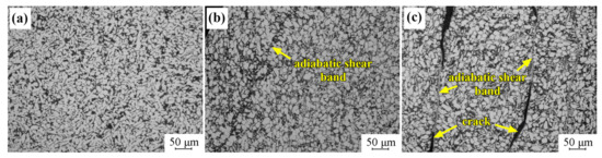 The microstructure evolution of Ti-6321 samples was investigated after the dynamic pressure testing, in order to explore the adiabatic shear behaviors of the Ti-6321 alloy under dynamic loading. Figure 7 exhibits the microstructure of EM samples after dynamic pressure under the strain rates of 1000 s−1, 2000 s−1 and 3000 s−1. It can be seen that dynamic pressure under the strain rate of 1000 s−1 has scarcely influenced the microstructure of the EM sample, as shown in Figure 7a. Under the strain rate of 2000 s−1, α grains have also maintained the equiaxed shape, and initiation of the adiabatic shear band can be seen in the EM sample, as shown in Figure 7b. When the strain rate is increased to 3000 s−1, distinct adiabatic shear behaviors occur in the EM sample, as shown in Figure 7c. Moreover, microcracks are seen to be initiated and propagated along the adiabatic shear bands. Figure 8 shows the microstructure of DM samples after dynamic pressure under the strain rates of 1000 s−1, 2000 s−1 and 3000 s−1. It can be seen in Figure 8a,b that dynamic pressure under the strain rates of both 1000 s−1 and 2000 s−1 has hardly influenced the microstructure of the DM sample. However, adiabatic shear bands are formed in the EM sample when the strain rate is increased to 3000 s−1, as shown in Figure 8c. Figure 9 exhibits the microstructure of the WM samples after dynamic pressure under the strain rates of 1000 s−1, 2000 s−1 and 3000 s−1. Initiation of adiabatic shear bands can be seen in the WM sample under the strain rate of 1000 s−1, as the arrows show in Figure 9a. Several adiabatic shear bands can be seen in the WM sample with the strain rate increasing to 2000 s−1 and 3000 s−1, as shown in Figure 9b,c. The adiabatic shear bands penetrated into the prior β grains. Moreover, microcracks are seen to be initiated and propagated along the adiabatic shear bands.