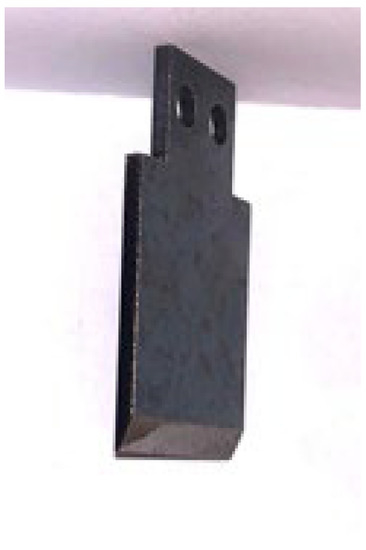 After the thermal cycling process, the specimens were placed in the universal testing device (Instron, Schimadzu Autograph Ag-50 Kng and Ag-500) for the measurement of their shear bond strength values. After a specially made tip (Figure 3), thinned on one side, was placed in the device, the part of this tip that would touch the bonding interface was adjusted, and the speed of the tip was set at 0.5 mm/min (Figure 4). The values measured during separation were recorded in Newtons and calculated in MPa by dividing the result by the surface area of the laminate and composite materials.