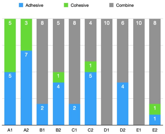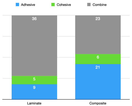 Fracture types (modes of failure) were divided into the adhesive, cohesive, and combine categories by imaging. As in the tables below, all composite groups had more specimens with the adhesive fracture type than the laminate groups did (Figure 5). Both of the groups had approximately similar specimens with the cohesive fracture type. Laminate veneer groups had more specimens with the combine fracture type than the composite groups did (Figure 6).