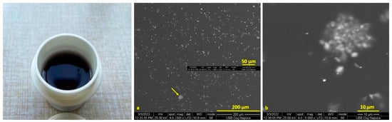 SEM images of the Cu-PEG mixture films are presented in Figure 1 and Figure 2. The Cu-PEG 400 and Cu-PEG 600 samples have a gel-like appearance, having a purple color that changes into dark brown after 2–3 days, as can be seen in the plastic minicontainers from Figure 1 and Figure 2. SEM images showed that the CuSO4 particles are well-dispersed into PEG400, having some clusters with Cu particles (Figure 1a,b) with sizes up to 10 µm. The Cu-PEG600 sample seems to have a better dispersion of Cu, even if some of the particles tend to agglomerate (Figure 2).