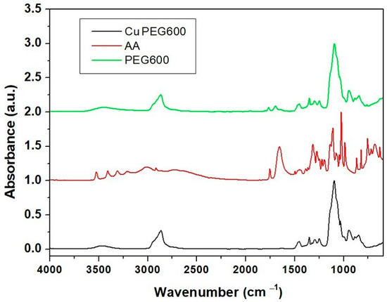 FT-IR spectra of copper clusters, ascorbic acid, and PEG 600.