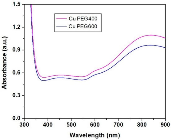 UV-VIS spectra of copper clusters obtained in PEG 400 and PEG 600, respectively.