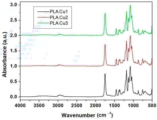 FT-IR spectra of PLA/Cu composites (samples PLACu1, PLACu2, PLACu3).