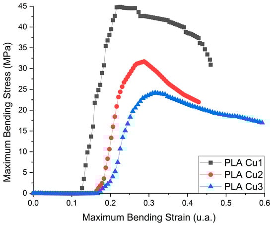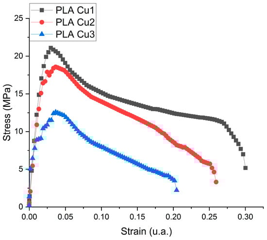 The tensile deformation curves for the PLA-Cu composites are presented in Figure 7 and the results obtained for tensile strength tests are in Table 3.