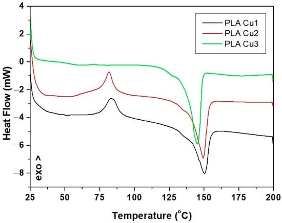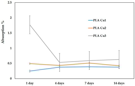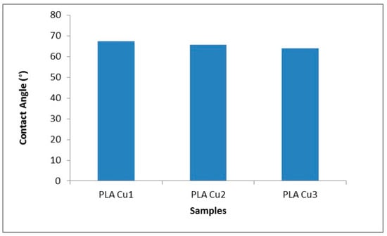 By DSC analysis, it was observed that the transformation temperatures of samples decrease, with an increase in the percentage of added additives. The increase in the content of Cu clusters leads to the decrease of average molecular weight of PLA, leading to a decrease in transition temperatures. The highest absorption of saline solution values were recorded for sample with 3% Cu throughout the entire investigation period. The contact angle decreases with the increase in the concentration of the Cu-PEG 600-mixture in the samples, improving the polarity of the recipes and forming hydrogen bonds between the surface of the composite samples and the water molecules.