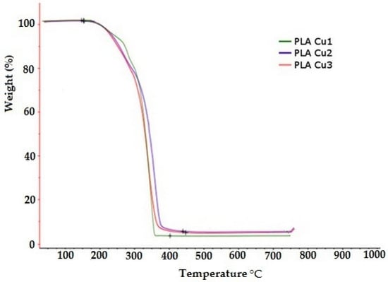 In order to obtain the PLACu samples, PLA was mixed in a Brabender Plastograph (Brabender® GmbH & Co. KG, Duisburg, Germany) at 180 °C temperature until melting, after which it was mixed with the plasticizer and Cu clusters dispersed in PEG for 15 min. under a nitrogen atmosphere. With the help of the hydraulic press, a plate with a dimension of 20 × 20 × 2 mm was obtained at 180 °C temperature and 15 atm pressure in 5 min. The composition of the samples and the obtaining conditions are presented in Table 1.