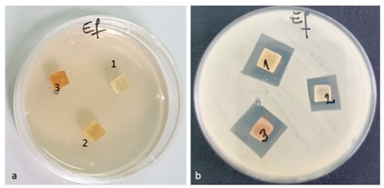 Enterococcus faecalis ATCC 29212 (a) zero (initial) moment, (b) inhibition after 48 h of incubation.