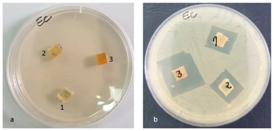 Escherichia coli ATCC 25922 (a) zero (initial) moment, (b) inhibition after 48 h of incubation.