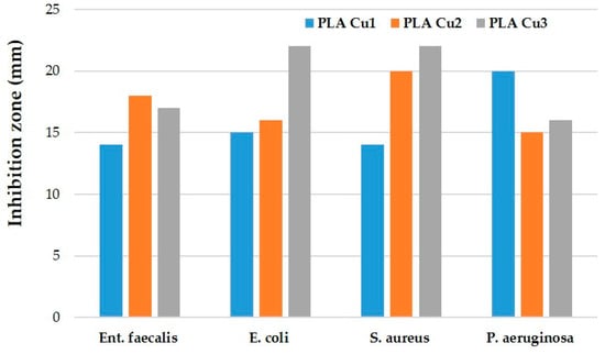 In contrast to the other tested strains, against the Pseudomonas aeruginosa ATCC 27853 bacterial strain, the highest inhibition by the PLACu1 sample (20 mm) was recorded. In the other two samples, the diameter of the inhibition zone was quite similar (Figure 17).