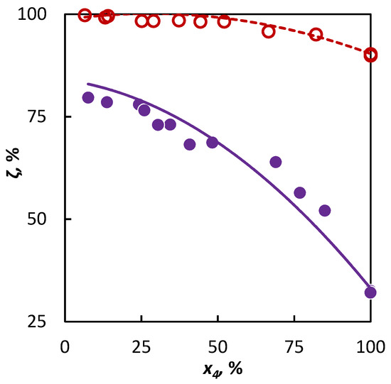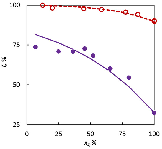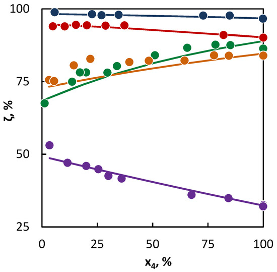 The deviation of the calculated values obtained by entering the parameter optimization values to Equation (3) from the experimental data is shown in Figure 1, where the points illustrate the experimentally obtained data, while the lines have been obtained according to Equation (3). In this and the following figures, no error bars for the individual points are reported, as the analytical standard deviation is smaller than the marker size. The error made due to the mixture preparation cannot be calculated from a repeated measurement as the mixture was prepared in approximate proportions and the exact composition was determined for each prepared mixture. The fitting of the experimental data to the model is very good, except for the saturated hydrocarbons, where the molecular reaction effects do not take place, which is indirectly a part of the radical activity parameter. Owing to the fact that the available data for unsaturated hydrocarbons prevail, the program for non-linear regression assumes here a higher conversion due to the molecular reactions. This can be avoided by an evaluation of the saturated hydrocarbons first and separately, and then, during the simultaneous evaluation of all the hydrocarbons, locking the consequently established parameter values, while the remaining values could be additionally optimized. However, this would infringe the validity of the established parameter values as they would not be consistent for all experimentally established values, which consequently, would prevent a mutual comparisons of all hydrocarbons, which was the original purpose of the regression model. At the same time, it could be possible to describe the molecular reactions by adding additional parameters into Equation (3). Nevertheless, this would result in a reduction of the parameter reliability on the one hand, and, in particular, deviating from the objective of comparing individual hydrocarbons on the other hand.