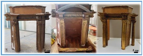 As previously mentioned, the uncatalogued object, which belongs to a private owner, was lacking four of the original six columns, which is why an integrative restoration was chosen through the reconstruction of the missing columns by means of 3D printing in PETG. Different operations were carried out on the two original columns and the copies in order to ensure compliance with the so-called five fundamental principles of restoration: recognizability, reversibility, compatibility, minimum intervention and interdisciplinarity. In fact, every restoration must be recognisable; therefore, any added part must be distinguishable from the original, without disturbing the overall look of the work. The phases of the conservation and aesthetic restoration of the original columns have included the consolidation of the wood with Paraloid B72, filling with Bologna gypsum and rabbit glue in lacking areas, and painting interventions aimed at formal chromatic balance. Pictorial retouching was carried out in “rigatino”, using the concept of chromatic selection, i.e., with fine hatching, which is recognisable compared to the original when observing the object from close up; from a distance, it allows a substantially unified reading of the decoration. On the PETG-printed copies of the column, a mimetic intervention was carried out, which involved preparing the background with Bologna plaster and rabbit glue, modelling with a scalpel, drafting the red bolus and the application of gold leaf with fish glue and finally burnishing to ensure its lustre over time (Figure 7).