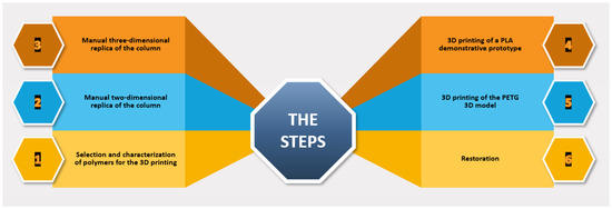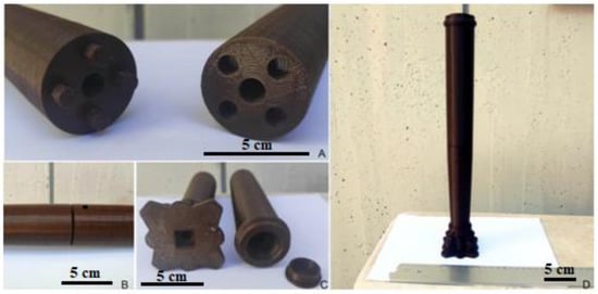 An accurate two-dimensional reproduction of the column was carried out manually. The poor state of preservation of the ciborium and the extremely reflective surfaces precluded a virtual scan. For the reproduction, the measurements were taken with the use of a caliber and the photographs from different angles of the column were used, in order to accurately draw the decorative parts, such as the capital. Afterwards, the CAD model of the column was obtained using Rhinoceros software (Robert McNeel & Associates, Seattle, WA, USA) and subsequently modified with Fusion 360 software (Autodesk, San Rafael, CA, USA). Cura software (Ultimaker B.V., Utrecht, The Netherlands) was used to convert the CAD file to an .STL file and for the slicing process.