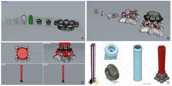 Steps of three-dimensional modeling of the column: modeling of the volutes (A) and the assembled capital (B) using Rhinoceros software; 3D model of the upper section of the column, front of the capital and whole column using Rhinoceros software (C); transversal section of the column (left) and modeling (right) of structural components using Fusion 360 software (D).