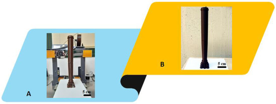 Based on the results obtained from the thermal and mechanical characterization of the two materials (reported in the Supplementary Materials, Section S1), and the refinement of the model from the analysis of the PLA prototype, PETG columns were finally printed (Figure 6). The printing took about 5 h and 30 min for the lower part (base) and about 7 h and 20 min for the upper part (capital) for each column. In contrast, the printing of the lid took about 20 min.