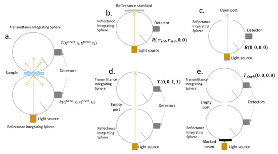 Schematic representation of the experimental setup depicting the double integrating sphere (DIS). (a) reflection and transmission measurements of the sample; (b) reflection measurement of the reflectance standard; (c) dark measurement for the reflection setup; (d) measurement with an empty port corresponding to 100% transmission and (e) dark measurement for the transmission setup.
