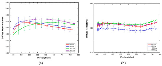 Spectral diffuse reflectance (a) and diffuse transmittance (b) for each one of the ITO-PET electrodes. Solid lines correspond to the mean value extracted from the measurements and their standard deviation is also indicated as vertical lines.