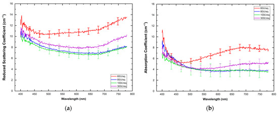 To solve the inverse problem, knowledge of the refractive index of the sample is required. Changes in the refractive index over the range of wavelengths employed in the present study were assumed negligible and, therefore, we consider the refractive index n = 1.827 for λ = 590 nm as the mean value for the visible range [40]. To determine the scattering anisotropy factor, we employed a customized goniometric optical setup (Figure S2) to measure the angular distribution of scattered light within the angular range of 0–175° [41]. The g values obtained are indicated in Table 2: