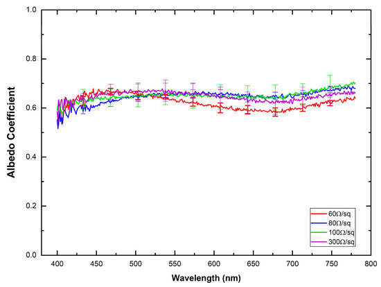 Spectral distribution of albedo coefficient for the different ITO-PET electrodes. Solid lines correspond to the mean value extracted from the measurements and their standard deviation is also indicated as vertical lines.