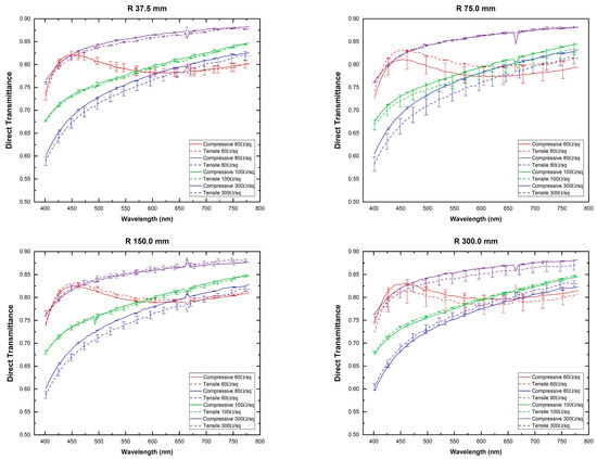 It has to be highlighted that direct transmittance does not show a clear modification as a consequence of the substrate curvature as all of them depict similar behavior. According to the manufacturer indications [35,36,37,38], a radius of curvature of up to 75 mm would not damage the ITO coating, and in our case, we have not observed significant modifications of both, optical and electrical performance when halving this radius to 37.5 mm.