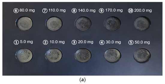 Figure 7 shows the linear regression between the weight of ferrous particles and voltage. The root mean squares of the linear fitting in Figure 7a,b were 0.983 and 0.974, respectively. Equations (1) and (2) show the relationships between the weight and voltage for fine and coarse particles, respectively, where; W (mg) is the average weight of ferrous particles and V is the voltage.