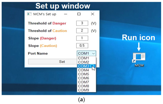A diagnostic program was developed using Java language to easily monitor the axle condition, as shown in Figure 9. When the user clicks the run icon (execution icon on the computer screen), a set-up screen appears, as shown in Figure 9a. The threshold values related to the weight of ferrous particles and gradient with time should be entered in the set-up screen. In addition, after setting the communication port, the set button is clicked to run the main screen, as shown in Figure 9b.