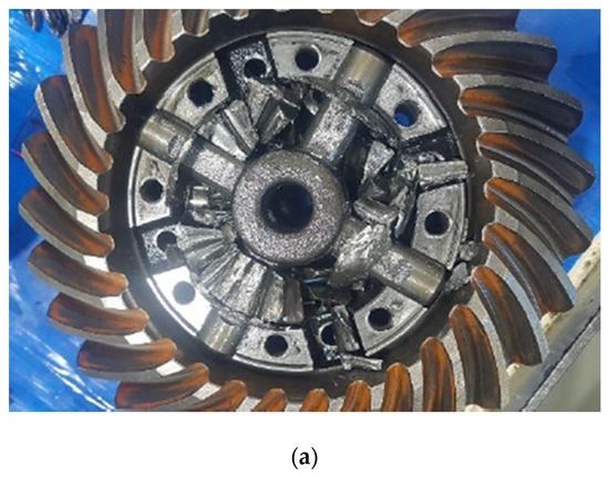 The durability tests were conducted on two types of newly designed axles during the development process. These newly designed axles are expected to be applied to 8-ton grade forklifts once they pass the durability and field tests. Figure 10 shows the experimental result of the first case; the graph on the left is the result of the overall experiment, and the blue dotted box indicates the abnormal condition. The graph on the right is an enlarged view of the results of the abnormal condition. The test was performed continuously for about 47 h until the axle gears broke, and severe wear or breakage occurred 2.5 min after onset. There was no increase in the amount of ferrous-wear particles before the severe breakage. At the point where the wear amount increased suddenly, the rate of change of the voltage with time was close to 1, i.e., the voltage increased almost vertically. Further durability tests were not possible owing to the sudden destruction of the gears in the axle. The damage to the gears in the axle and ferrous-wear particles attached to the sensor are shown in Figure 11. In Figure 11a, the gears in the axle are observed to be destroyed to such an extent that their shapes could not be confirmed. Figure 11b shows a large quantity of ferrous-wear particles gathered at the measuring part of the sensor.