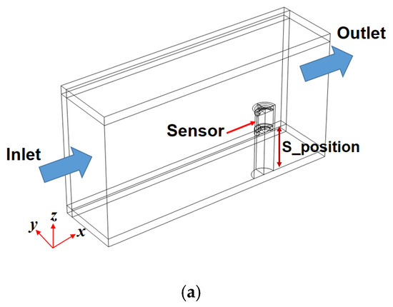 From the perspective of the aforementioned solution without considering the flow caused by the movements of various gears in the actual axle, a simple method is introduced here. This is not an exact solution to the problem, but rather an approach to solving it. The commercial multi-physics software, COMSOL 6.0 was used for the calculations. The electromagnetic field interface model, particle tracing module, and Navier–Stokes equations are used in the numerical analysis. The electromagnetic field interface model is included in the COMSOL AC/DC module, and this model is used to calculate the magnetic flux of the ferrous particle sensor. The particle tracing module is a numerical method of computing the paths of individual particles by solving their equations of motion over time; this module solves a number of discrete trajectories. Using this module, it is possible to assess whether the ferrous particle sensor captures the trajectories of the ferrous particles in the flow well. Figure 14 shows the numerical model of the ferrous particle sensor; it is difficult to obtain accurate design specifications, such as the material of the Gill sensor used in the experiments. The major design parameters were roughly investigated by the sensor disassembly, and the roughly measured design parameters are reflected in the analysis. Moreover, the material of the magnetic core is low-carbon steel M-50, and the B-H curve uses the data given in the analysis program. The sensor was analyzed using a two-dimensional axisymmetric model. Figure 15 shows the numerical model for sensor positioning; all faces except the inlet and outlet are set as stationary walls. Various elements such as tetrahedron, pyramid, prism, hexahedron, and quad were used in the numerical analysis. The total number of elements used is 476,338, and a dense mesh was applied to the measurement area of the sensor; this analysis was conducted using a planar symmetric model. The size of the flow channel is 70 mm × 70 mm × 150 mm, and the flow is laminar. The working conditions of the numerical calculations are shown in Table 4. The particles used in the analysis are spherical and the material is iron with a density of 8030 kg/m3. The properties of the lubricant used in the analysis are shown in Table 2. In Figure 15a, S_position indicates the distance from the bottom to the measuring part of the sensor; as the value of S_position increases, the distance from the bottom to the sensor increases, along with an increase in the area of the sensor exposed to the lubricant.
