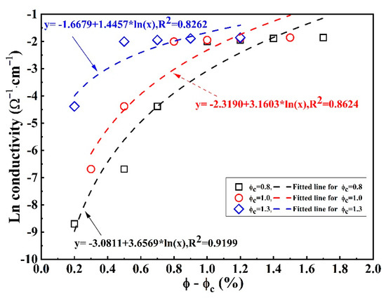 Concerning the relationship between the conductivity and the content of conductive materials, the percolation transition zone has been widely found in the curve, which could be explained by the application of percolation theory. Based on this, a percolation equation has been used to characterize the relationship between conductivity and conductive material content [20]. However, this equation had some significant disadvantages; for example, it is difficult to determine the value. To make matters worse, graphene contents lower than the value were not included in the domain of the definition. Hence, there was an urgent need to find out a new model or equation by which the comprehensive characterization of the relationship between the conductivity and the whole contents could be realized.