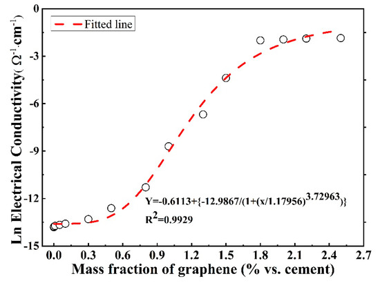 As shown in Table 4, the RE values for these chosen graphene concentrations are lower than 10%, which indicates that the predicted values calculated by Equation (5) have a small deviation compared to those measured values. This logistic model is recommended by the authors to characterize the relationship between the conductivity and the content of conductive materials such as steel powder, graphite powder, carbon fiber, carbon nanotube, and graphene in the composites.