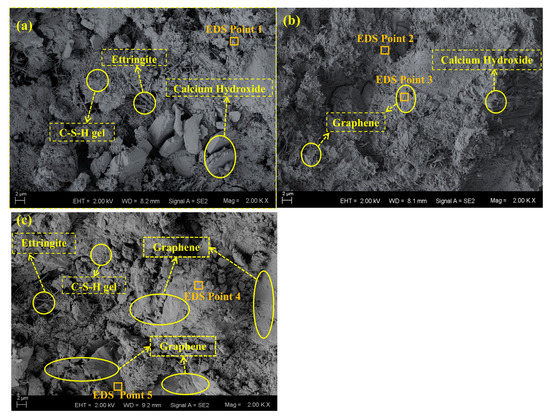 EDS analysis results of the chosen points in Figure 7 are also presented in Table 5. It should be pointed out that only five elements (i.e., carbon (C), oxygen (O), calcium (Ca), silicon (Si) and aluminum (Al)) were taken into account in this analysis. The results of point 1, 2, and 4 represent the element composition of cement hydration products in composites with different graphene contents, which show a high degree of similarity. The main elements in cement hydration products consist of Ca and O elements, followed by Si element. Small amount of C and Al elements are also detected. Differing from the cement hydration product, the element compositions of the graphene slices in composites are presented as point 3 and 5 in Table 5. Only one primary element (i.e., C element) has been found, as the mass fraction of C exceeds 80%. In other words, the results also prove that the slice in the composites is graphene because there is only C element in the composition of graphene. Previous analyses have shown that a low content of C element is detected in the cement hydration product. Through the EDS technique, the element compositions for the chosen places in the graphene/cement composites can be obtained, by which graphene slices can be distinguished from the cement hydration products.