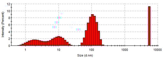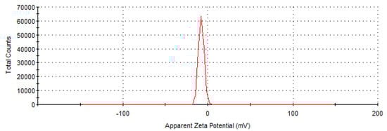 The size of collagen particles measured possess an average of 1150 nm with majority populations at 109.3 nm (52.3%), 9.7 nm (22.3%), and 1.9 nm (14.3%) (Figure 1) and a zeta potential value of −7.64 mV (Figure 2), as presented in Table 2.