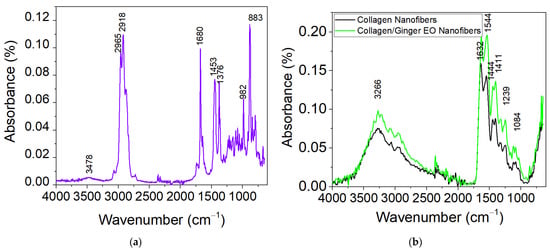 The ATR-FT-IR spectra for the ginger EO and nanofibers based on hydrolysed collagen loaded with ginger EO and hydrolysed collagen (control) are shown in Figure 3. The maximum absorption of ginger EO appeared at the characteristic bands (Figure 3a), as follows: 3478 cm−1 (–OH groups from phenols), 2918 cm−1 (asymmetric stretching vibration of –CH2 group), 1680 cm−1 (stretching vibration of –C=O), 1453 cm−1 (–C–H group), 1376–1082 cm−1 (–C–O–C group), 982 cm−1 (C–C group), and 982–883 cm−1 (C–C–H) [50,52].