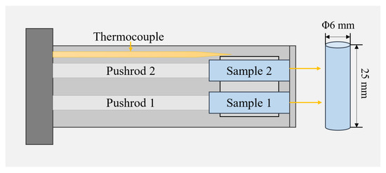 The heat treatment process for rolled 2024Al is water quenching immediately after being dissolved in a 495 °C salt bath furnace for 1 h, and the time should be within 10 s. The samples used for real-time detection of dimensional changes during constant temperature aging shall be immediately put into the thermal dilatometer (Netzsch Co., Ltd., Selbu, Germany), and the test environment is 190 °C constant temperature aging for 72 h. The test equipment is shown in Figure 1. The sample is a cylindrical sample cut on the raw material block by electrical discharging machining (EDM), and the sample shape is Φ6 × 25 mm. The samples used for TEM observation and XRD detection shall be immediately put into a 190 °C drying oven. According to the time required for the test, the constant temperature aging time is 2 h, 4 h, 15 h, 24 h, and 72 h, respectively.