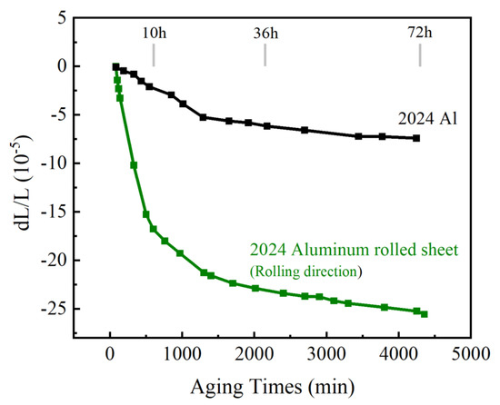 With the development in aerospace, 2024 aluminum alloy has been widely used in basic components as structural materials due to its excellent mechanical properties and low density [1,2,3]. The dimensional change in this aluminum alloy structural material often requires the dimensional change to be accurate to 10−6~10−7. Beyond this range, navigation errors of aerospace equipment will occur, leading to a series of problems. Therefore, it is very important to study the dimensional change in aluminum alloy materials [4,5,6].