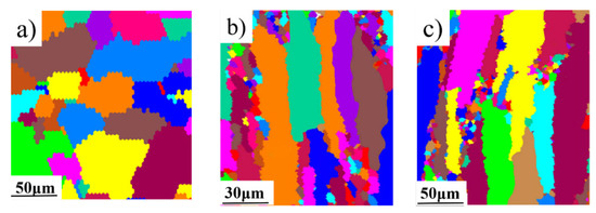 The grain morphology of the raw rolled 2024Al in three directions was observed by EBSD, and the initial morphology is shown in Figure 3. Figure 3a shows the cross-section of the raw material, with good equiaxed grains. Figure 3b,c show that the grains on the parallel rolling plane and the longitudinal plane are elongated and deformed under the rolling action. There are some fine grains in the fiber shape at the same time. The length direction of the elongated grains is almost parallel to the rolling direction, which is consistent with the results observed in the literature [17,20]. During rolling, the grains will be elongated along the deformation direction to produce texture, so that certain crystal planes and crystal directions of each grain are parallel to the rolling direction (preferred orientation), as shown in Figure 3.
