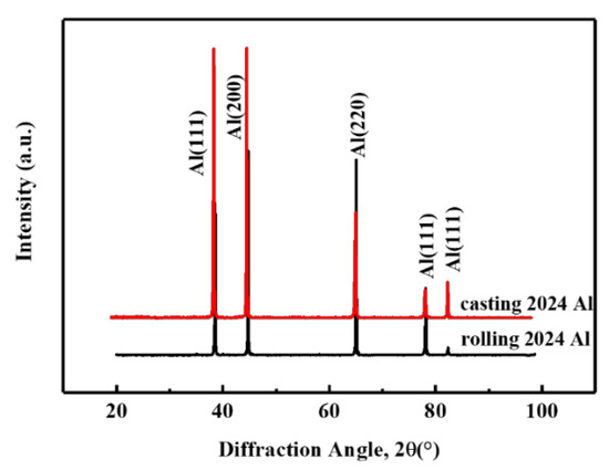 In order to obtain the influence of the change in lattice constant on the dimensional change in the rolled 2024Al before and after constant temperature aging along the rolling direction at 190 °C, we measured the solid solution state of the rolled plate and the XRD after aging for 72 h, and the results are shown in Figure 6. Figure 6a shows the XRD pattern of the as-rolled 2024 Al after solution and quenching. It can be seen that only the aluminum peaks can be observed in the sample at this time. In Figure 6b, it can be seen that not only the aluminum peak but also the Al2CuMg (S phase) peak exist in the rolled plate after aging for 72 h, which is consistent with the observation in the literature [35], indicating that Al2CuMg phase precipitates from the rolled plate after aging for 72 h.