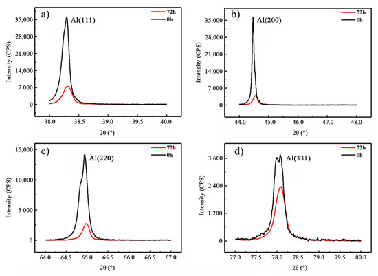 Firstly, the changes in lattice constants of rolled 2024Al before and after aging were qualitatively analyzed and compared. As shown in Figure 7, the peak positions of four diffraction peaks (111), (200), (220), and (311) of aluminum aged for 0 h and 72 h were compared. It was found that the four diffraction peaks of the aged samples moved to the right. According to Bragg’s law, the lattice constant of rolled plate decreases after aging. Secondly, the changes in lattice constants before and after aging were quantitatively compared. The lattice constants of samples aged for 0 h and 72 h were accurately calculated using Jade5 XRD analysis software, and the results are shown in Table 3. The average lattice constants of the rolled 2024Al before and after aging are 0.40544 nm and 0.40392 nm respectively, and they decrease by 0.00152 nm after aging for 72 h.