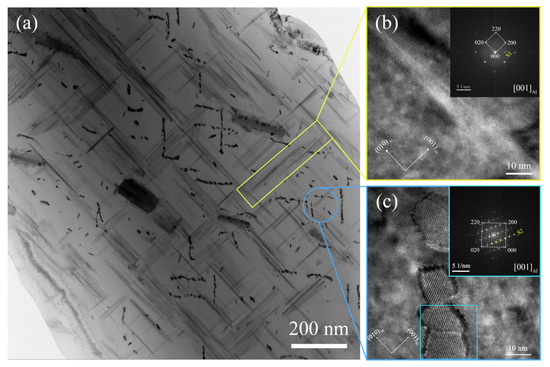 The microstructure and precipitates of the sample after heat treatment were observed by field emission transmission electron microscopy (TEM, JEM-2010F, JEOL, Tokyo, Japan). TEM samples are prepared by electrolytic double-spray thinning. The thinning solution is a mixture of 30% nitric acid and 70% methanol solution. During the operation, liquid nitrogen is used to cool the electrolyte. The temperature is controlled below −25 °C, the voltage is about 12~15 V, and the current is about 70 mA.