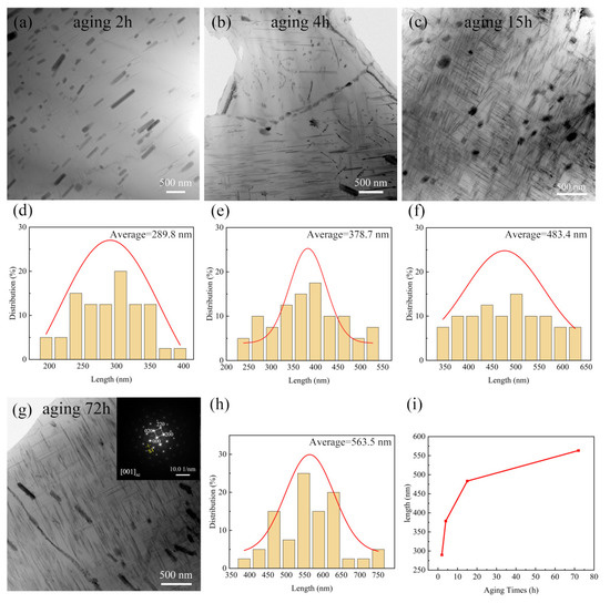 To obtain the main factors of the precipitates in the dimensional change in the rolled 2024Al during constant temperature aging, and the influence of the orientation and content of the precipitates on the dimensional change difference between the rolled 2024Al and the as-cast 2024Al during constant temperature aging precipitation, this section observed and counted the morphology change in the precipitates in the rolled 2024Al bright field phase and the length statistics of the lath-like S1 precipitates with the increase in the constant temperature time effect at 190 °C [44], as shown in Figure 10. At the same time, the difference in the orientation and the number density of precipitates between the two materials after aging for 24 h was observed and counted [9], as shown in Figure 11.