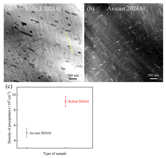 It can be seen from Figure 11a,b that the type and morphology of precipitates generated by the two are the same [46], the generation of precipitates from rolled 2024Al has obvious orientation [47], and the as-cast 2024Al has no orientation. According to the statistics of the number density of precipitates, it is found that the number density of precipitates of as-cast 2024Al is 5.0 × 109 cm−2, while the number density of precipitates of rolled 2024Al is 9.1 × 109 cm−2, obviously higher than as-cast 2024Al, as shown in Figure 11c. The different orientation of precipitates is mainly due to the existence of a certain habit plane between the formation of precipitates and the matrix, and the change in grain orientation will occur during rolling. The precipitates of rolled 2024Al are more formed in the direction close to the rolling direction, and the quantity is more than that of as-cast 2024Al, so the aging precipitation process leads to different dimensional changes in the two materials.