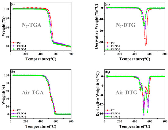 TGA and DTG curves of PC and FRPCs under N2 (a,a1) and air (b,b1).