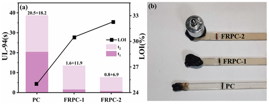 As seen in Raman spectra of char residues (Figure S4), two sharp peaks appear at 1360 cm−1 (D band) and 1600 cm−1 (G band), which are assigned to the disordered carbon impurities (or defects) and 2D hexagonal graphitic lattice, respectively [33,34]. Normally, a lower area ratio (AD/AG) of the two peaks reveals a higher graphitization degree. It is found that the AD/AG value is decreased from 2.92 for pure PC to 2.41 for FRPC-1 and 2.26 for FRPC-2, revealing that the DASO has a catalytic effect on the graphitization of the char residues.