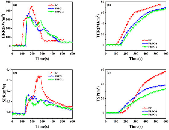 Generally, the THR and peak of HRR (PHRR) are valued as crucial parameters to reflect the combustion intensity. In comparison with THR of 74.2 MJ/m2 and PHRR of 443.5 kW/m2 for pure PC, these values reduce steadily with the incorporation of DASO. Especially, the minimum values, including 70.2 MJ/m2 of THR and 326.1 kW/m2 of PHRR, are achieved for FRPC-2. It demonstrates that the presence of DASO plays inhibiting function on the heat release during combustion. Likewise, toxic smoke is also considered a harmful factor in a real fire [31]. As shown in Figure 3c and Table 3, both SPR and TSP values reduce obviously with the loading of DASO. Particularly, FRPC-2 composite gives the lowest TSP of 35.4 m2 and PSPR (peak of SPR) of 0.15 m2/s, with a reduction of 44.2% and 55.9% by comparison with pristine PC, respectively. It reveals that DASO also has better smoke suppression. Additionally, the fire growth rate index (FIGRA = PHRR/TPHRR) is adopted to assess underlying fire spread or growth hazards during burning. As seen in Table 3, the FRPC-2 displays the lowest FIGRA value (2.04 kW/m2·s) among all samples, reflecting that fire safety is improved with the introduction of DASO.