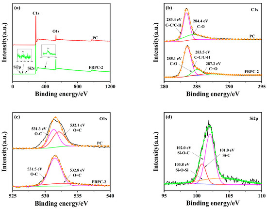 XPS survey spectra (a), C1s (b) and O1s (c) of PC and FRPC-2; Si2p (d) spectra of FRPC-2.
