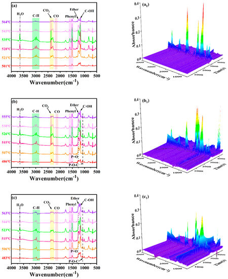 FTIR spectra of gaseous products at various temperatures under nitrogen and 3D images of PC (a,a1), FRPC-1 (b,b1), and FRPC-2 (c,c1).